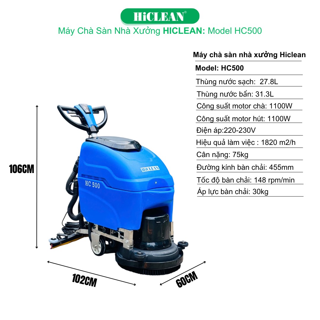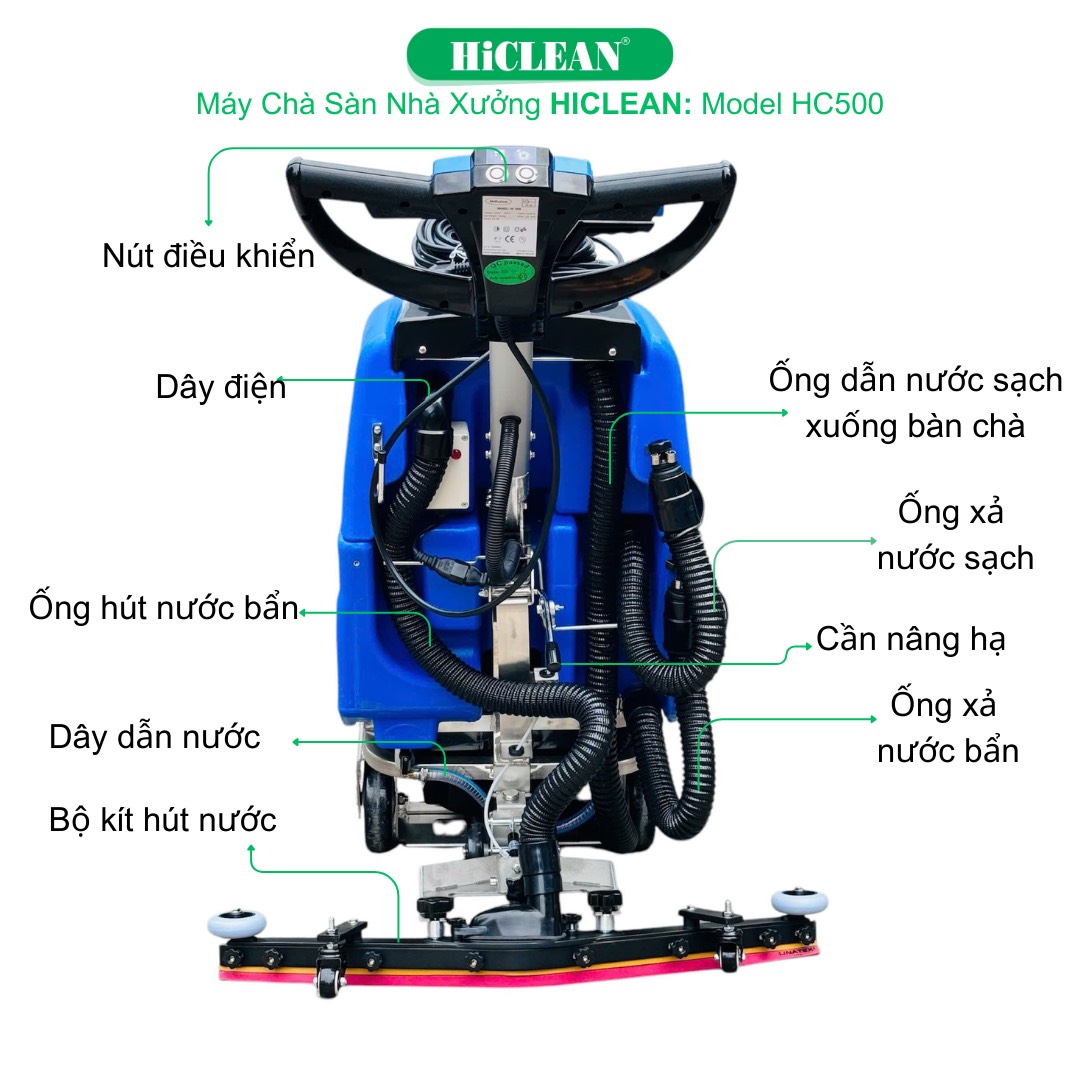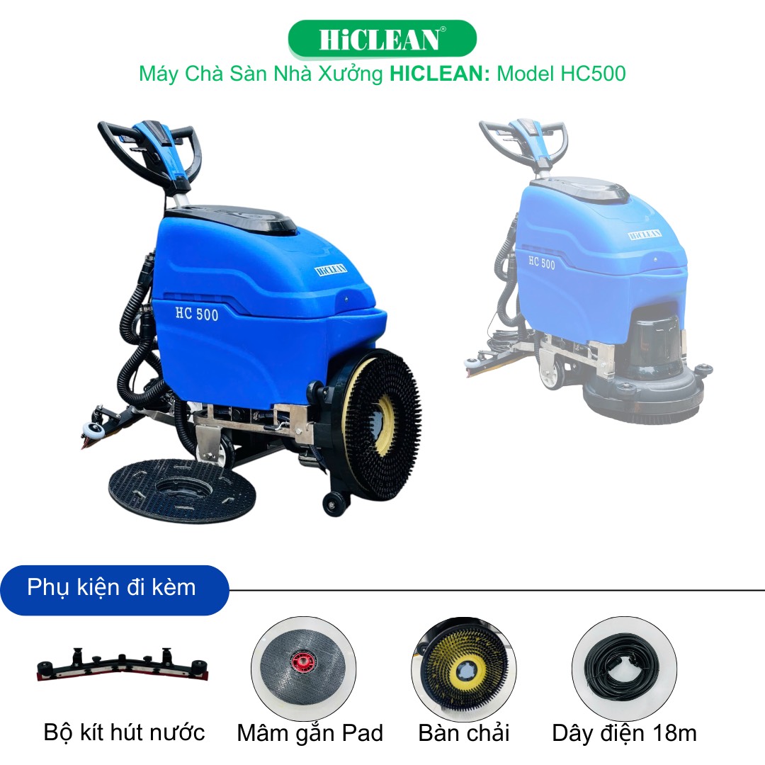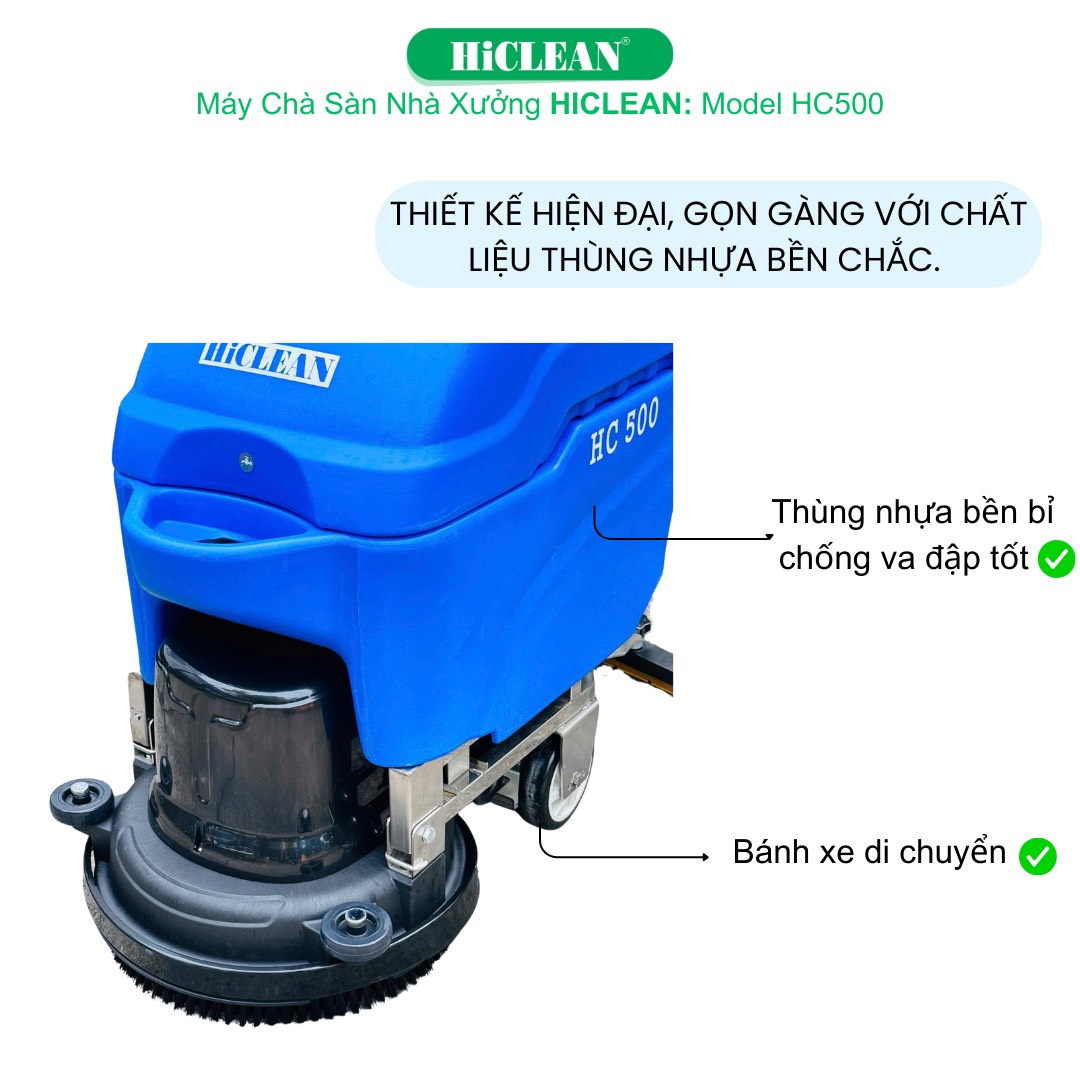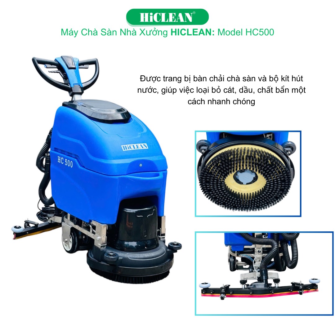 Máy chà sàn liên hợp HiClean HC 500 là thiết bị vệ sinh sàn nhà tiên tiến và chất lượng cao, được thiết kế để mang lại hiệu quả làm sạch vượt trội cho mọi không gian. Với công nghệ hiện đại và tích hợp đầy đủ các tính năng cần thiết, sản phẩm này giúp người dùng giải quyết công việc dọn dẹp một cách nhanh chóng và dễ dàng. Điểm nổi bật của máy là khả năng kết hợp đồng thời chức năng chà sàn và hút nước, giúp tiết kiệm đáng kể thời gian và công sức so với việc sử dụng các thiết bị vệ sinh riêng lẻ. Được trang bị động cơ bàn chải mạnh mẽ với công suất 1100W, HiClean HC 500 có khả năng loại bỏ hiệu quả nhiều loại vết bẩn khác nhau, từ bụi bẩn thông thường đến dầu mỡ bám dính trên nhiều bề mặt sàn. Sản phẩm này là lựa chọn lý tưởng cho các khu vực có diện tích lớn như nhà xưởng, bệnh viện, trường học, trung tâm thương mại và các cơ sở công nghiệp khác, nơi đòi hỏi tiêu chuẩn vệ sinh cao và hiệu suất làm việc tối ưu.