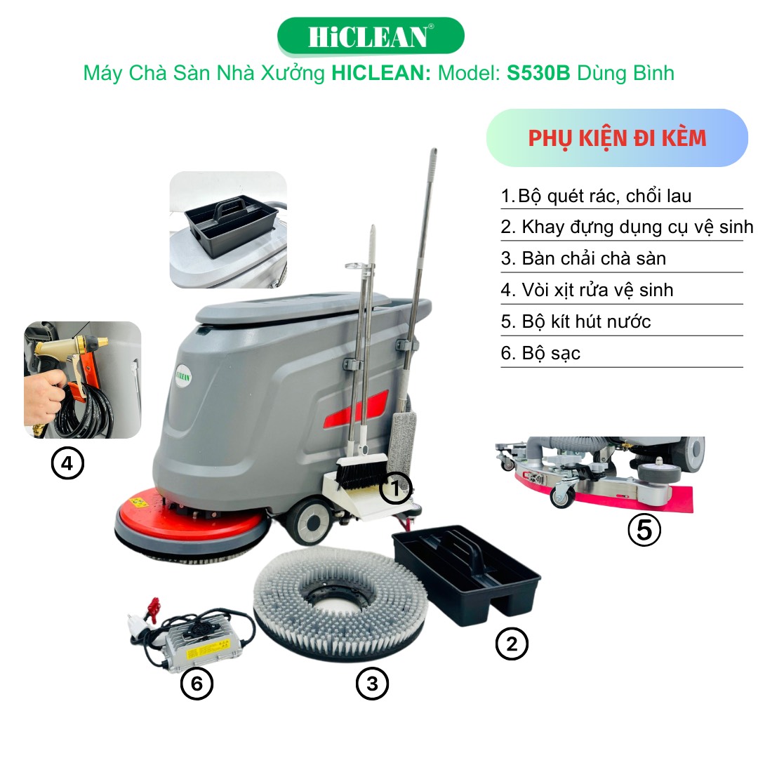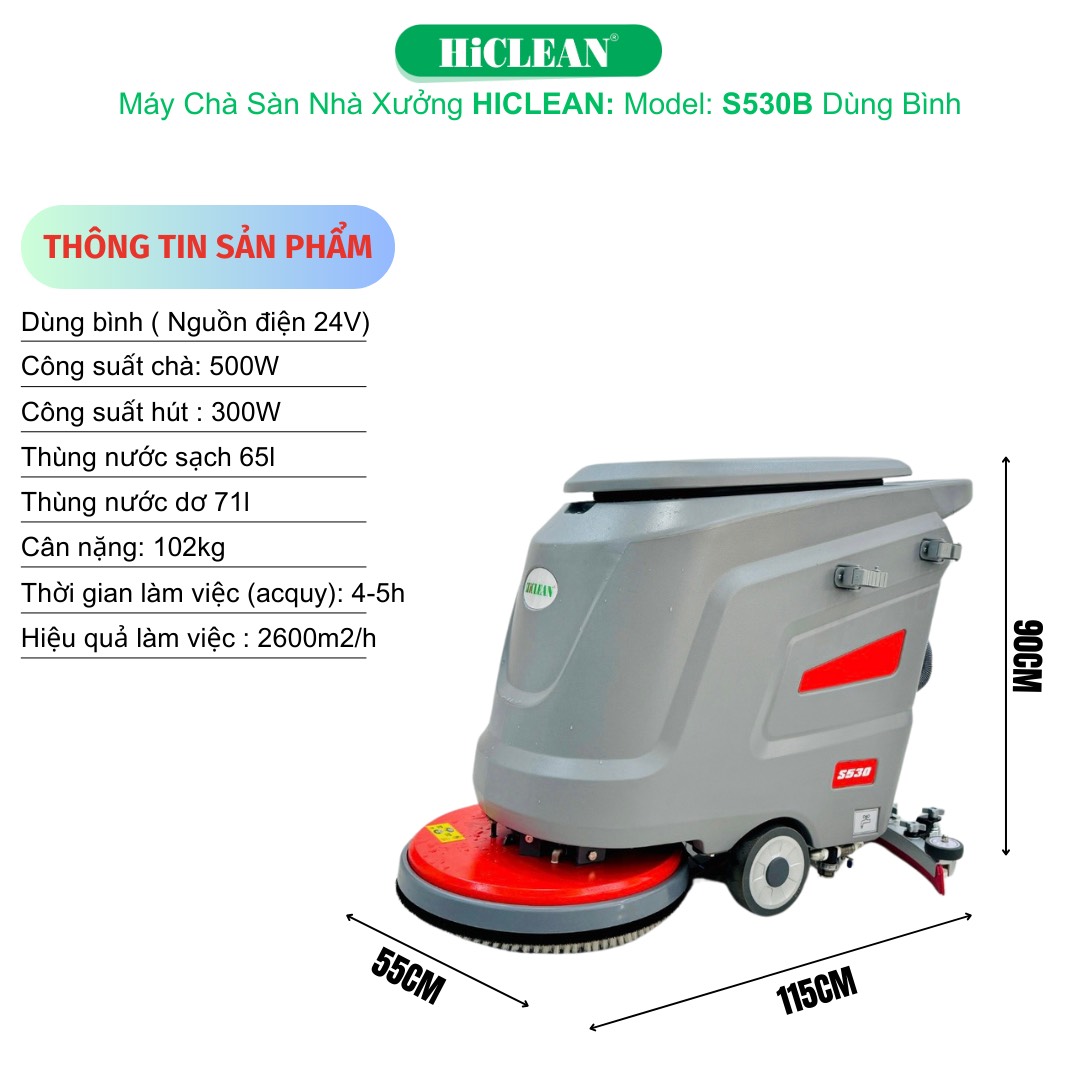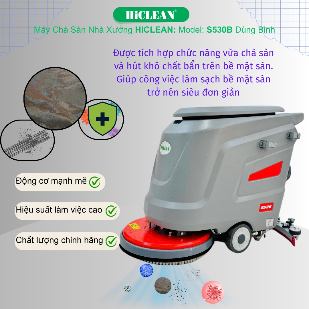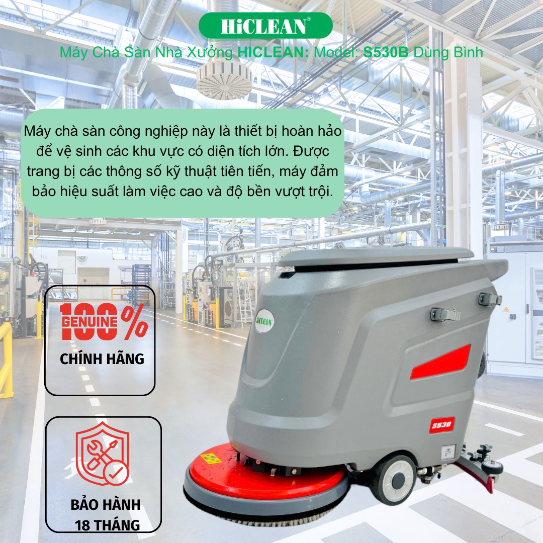 Máy chà sàn liên hợp HiClean S530B, sử dụng nguồn điện từ ắc quy, là một giải pháp vệ sinh công nghiệp tiên tiến, được thiết kế để mang lại hiệu quả làm sạch vượt trội cho các không gian rộng lớn. Sản phẩm này tích hợp đồng thời chức năng chà và hút nước, giúp sàn nhà không chỉ sạch mà còn khô ráo ngay sau khi vệ sinh. Với nguồn năng lượng từ bình ắc quy 24V/120Ah , máy có khả năng hoạt động liên tục từ 4 đến 5 giờ , đảm bảo quá trình làm sạch không bị gián đoạn. Đặc biệt, thiết kế không dây của máy mang lại sự linh hoạt tối đa, cho phép người dùng dễ dàng di chuyển và làm sạch ở mọi ngóc ngách mà không bị vướng víu bởi dây điện. Với chiều rộng làm việc lên đến 530mm và hiệu suất làm việc ấn tượng 2600m²/h , HiClean S530B là sự lựa chọn lý tưởng cho nhiều loại hình không gian công nghiệp và thương mại như nhà xưởng, bệnh viện, trường học, siêu thị và các khu vực công cộng khác, nơi đòi hỏi tiêu chuẩn vệ sinh cao và hiệu quả làm sạch nhanh chóng.