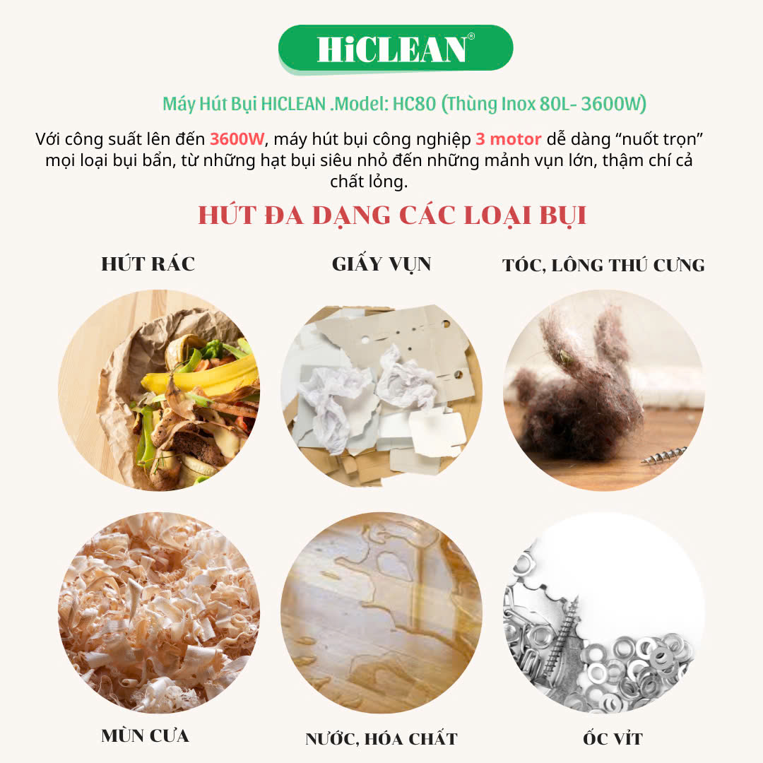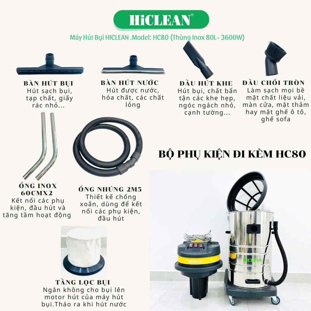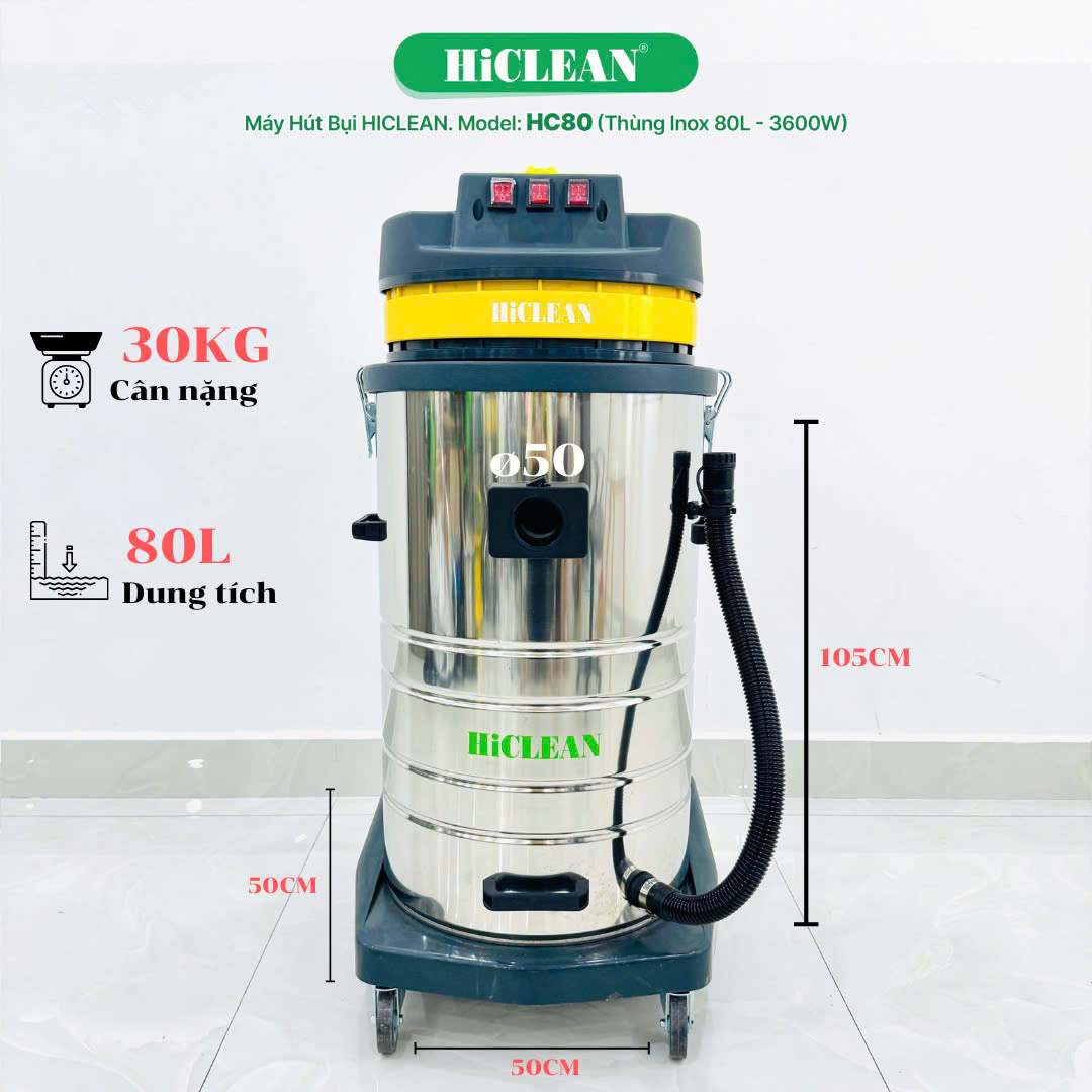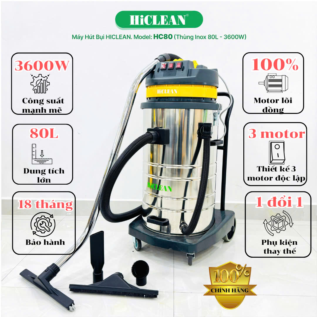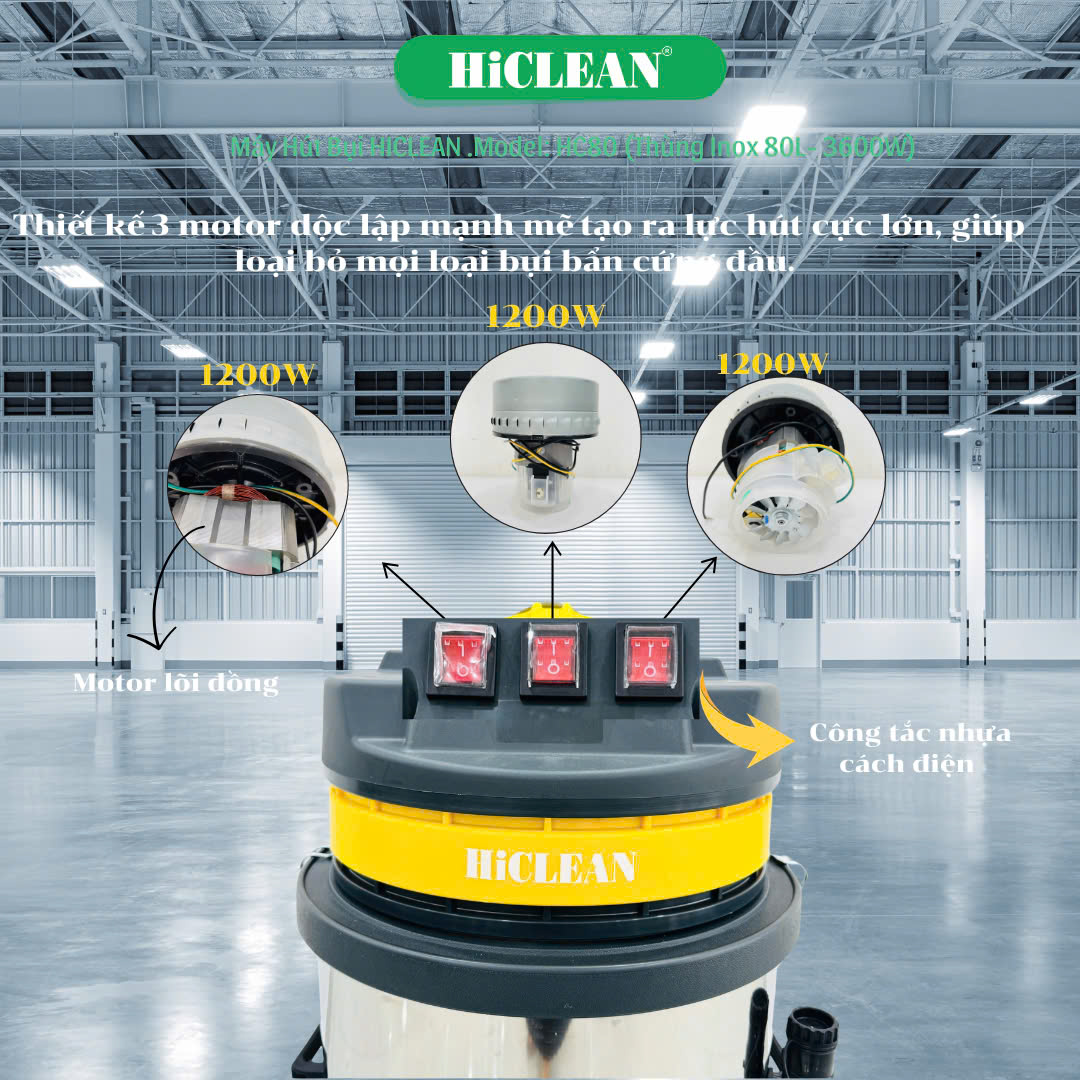 HiClean HC80 là một trong những sản phẩm tiêu biểu của thương hiệu HiClean - một trong những thương hiệu dẫn đầu trong lĩnh vực máy hút bụi công nghiệp. Sản phẩm được thiết kế với 03 motor và công suất 3600W, mang đến cho người dùng sức mạnh và hiệu quả đáng kinh ngạc trong việc hút các bụi bẩn công nghiệp.