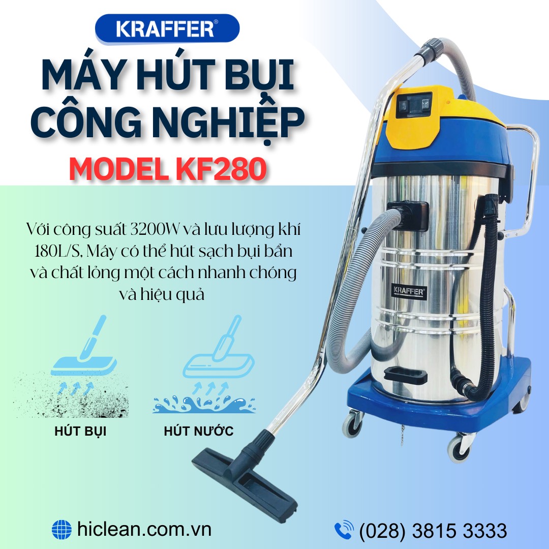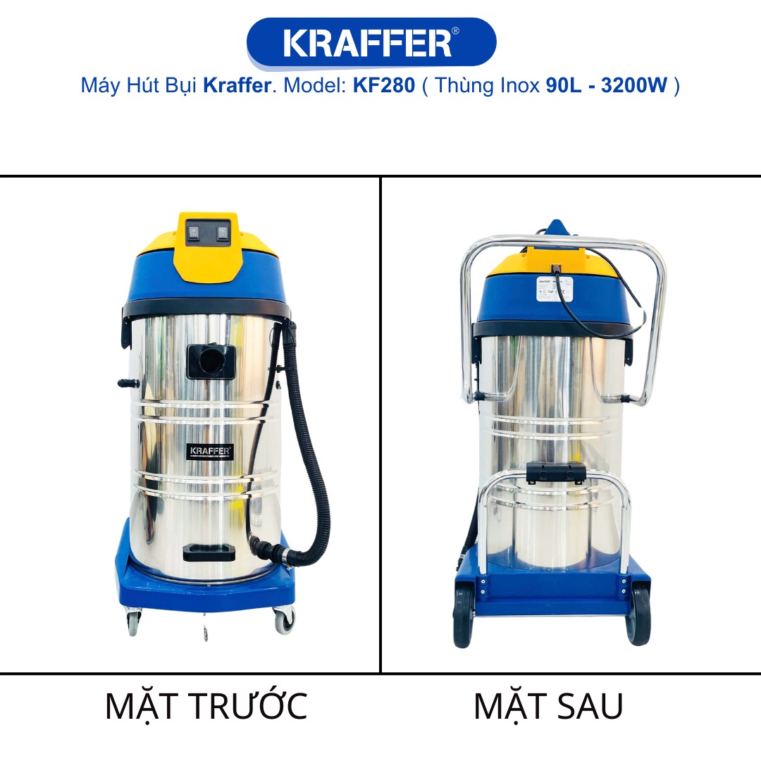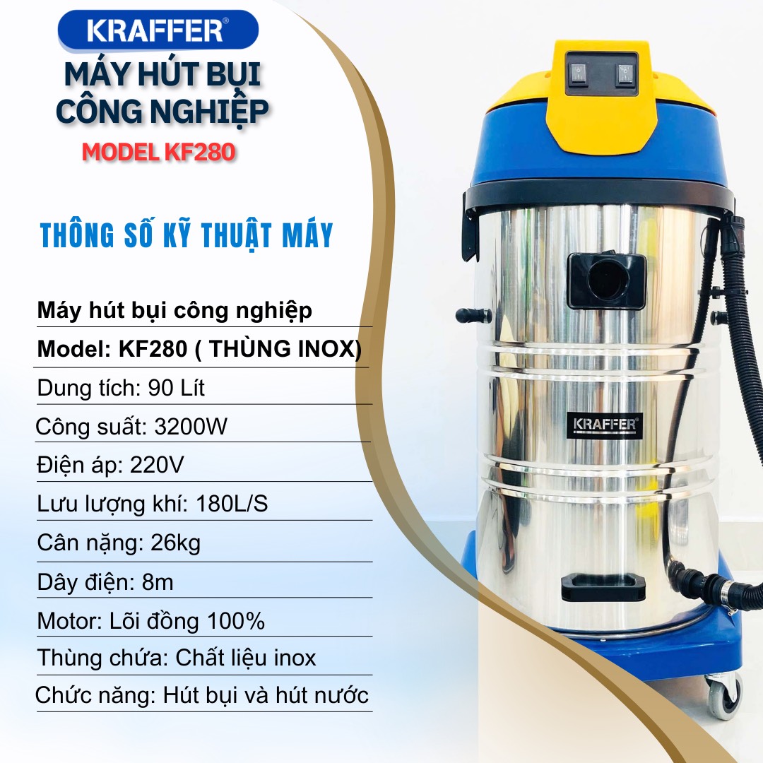Nếu bạn đang tìm kiếm một chiếc máy hút bụi công nghiệp, KRAFFER KF280 là một lựa chọn tuyệt vời. Với công suất 3200W và lưu lượng khí 180L/S, máy có thể hút sạch bụi bẩn một cách nhanh chóng và hiệu quả. Đặc biệt, máy có thể hút cả khô lẫn ướt, nên bạn không cần phải lo lắng về việc sử dụng máy trong những ngày mưa hay khi vệ sinh sàn nhà. Với dung tích thùng chứa 90L, bạn không cần phải thường xuyên thay thế túi lọc, tiết kiệm thời gian và công sức của bạn.