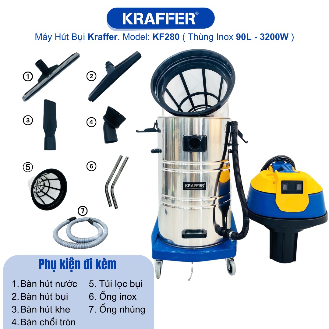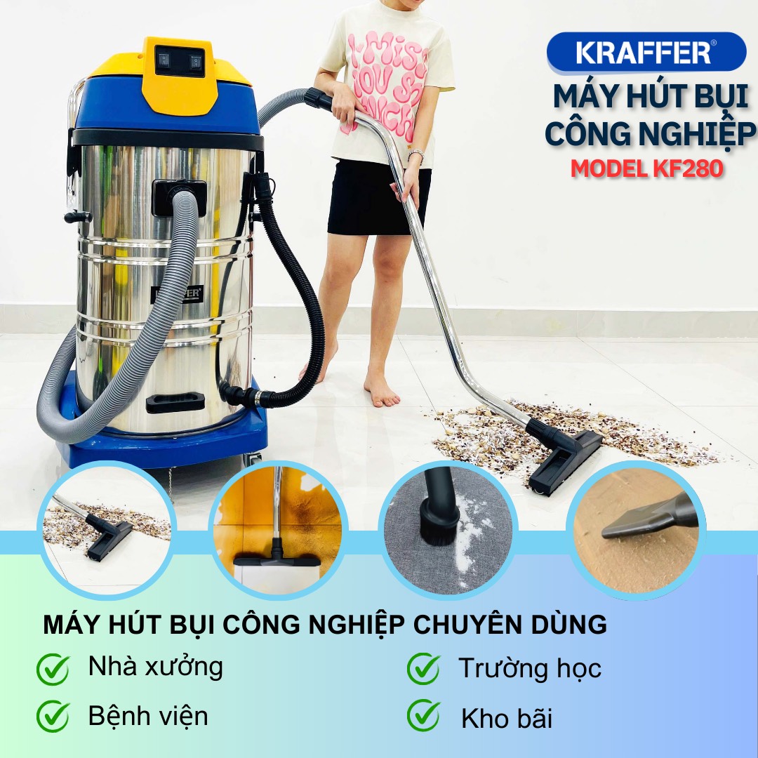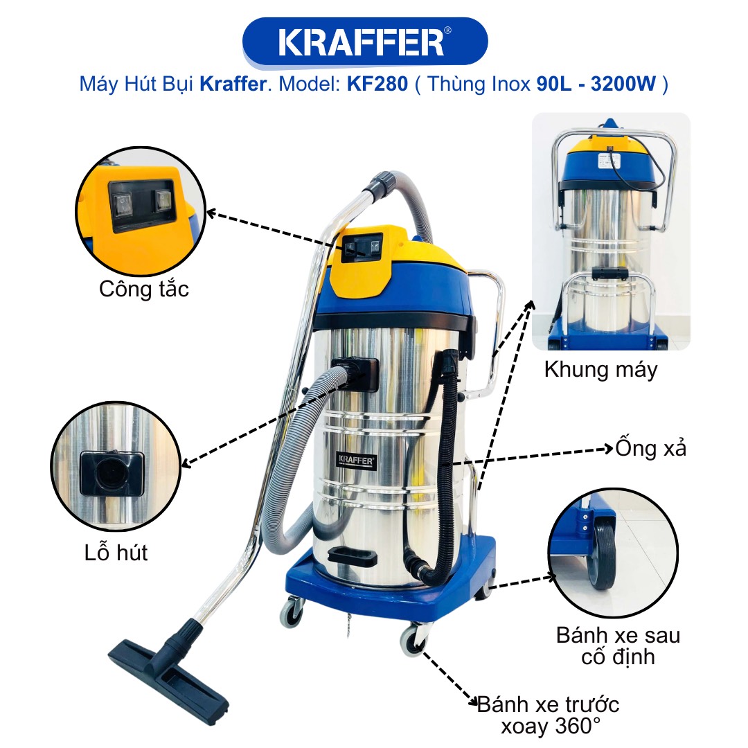 Nếu bạn đang tìm kiếm một chiếc máy hút bụi công nghiệp, KRAFFER KF280 là một lựa chọn tuyệt vời. Với công suất 3200W và lưu lượng khí 180L/S, máy có thể hút sạch bụi bẩn một cách nhanh chóng và hiệu quả. Đặc biệt, máy có thể hút cả khô lẫn ướt, nên bạn không cần phải lo lắng về việc sử dụng máy trong những ngày mưa hay khi vệ sinh sàn nhà. Với dung tích thùng chứa 90L, bạn không cần phải thường xuyên thay thế túi lọc, tiết kiệm thời gian và công sức của bạn.