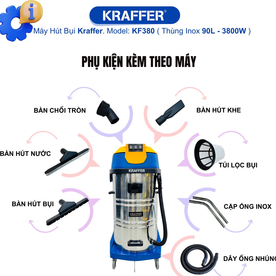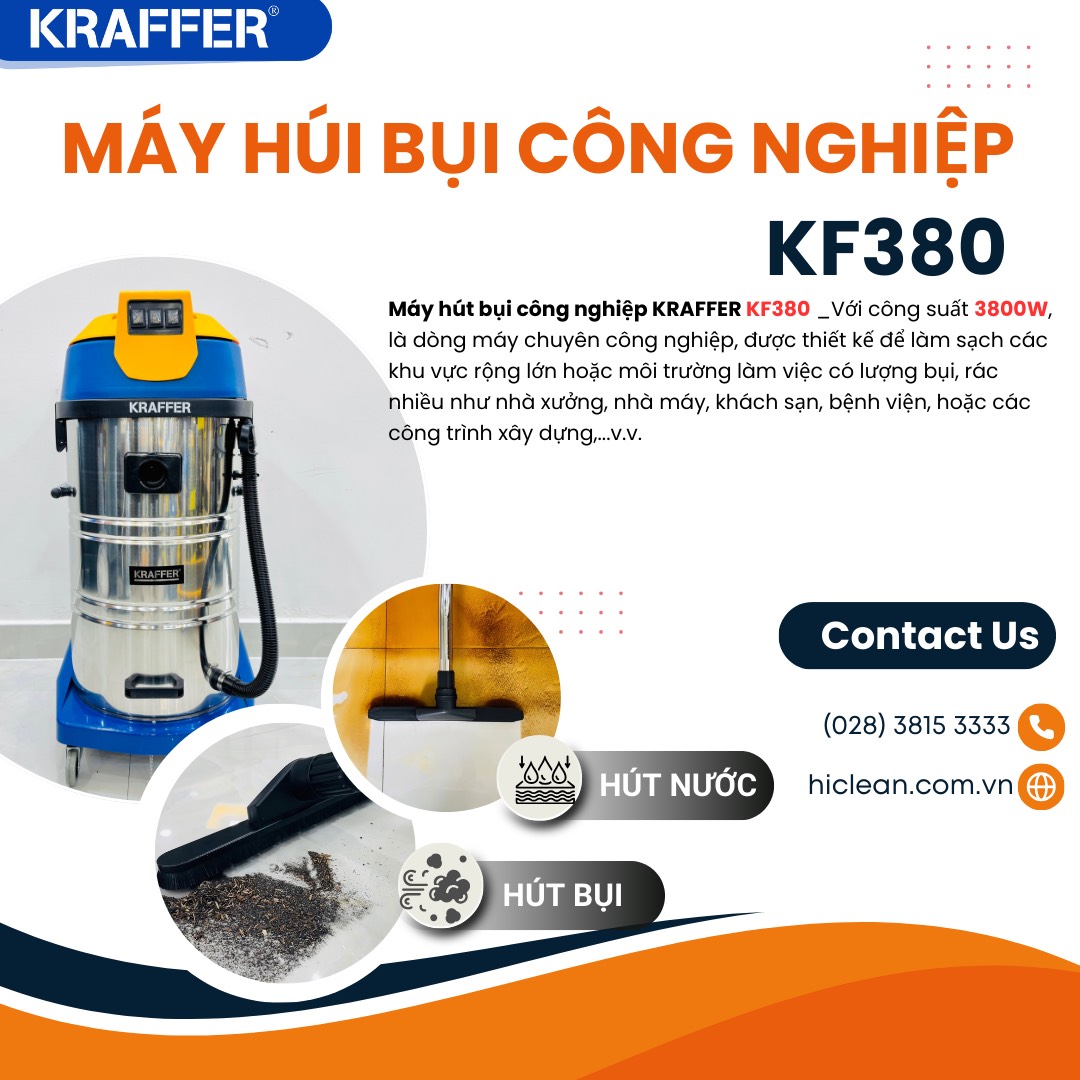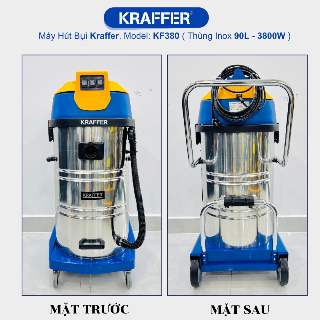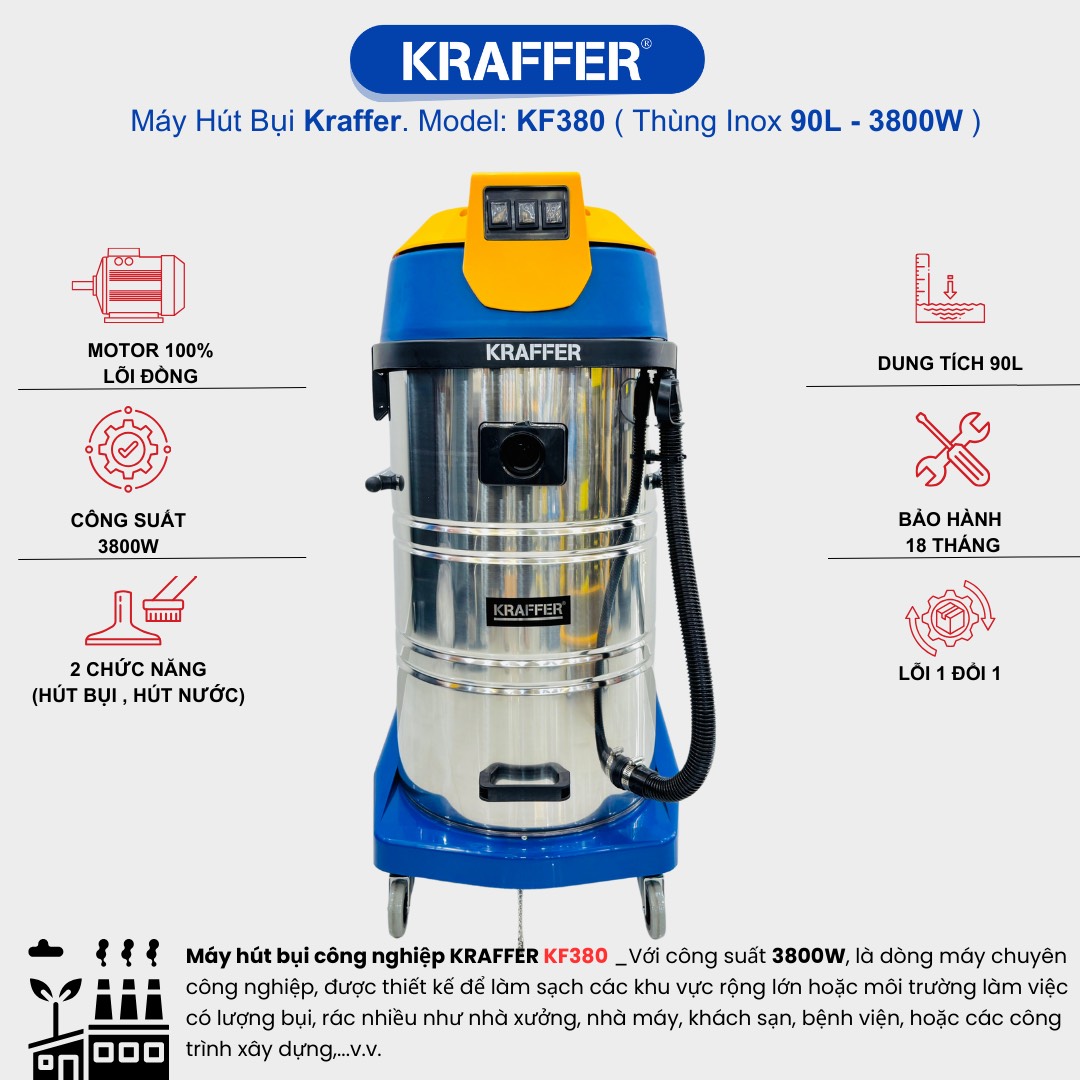 Nếu bạn đang tìm kiếm một chiếc máy hút bụi công nghiệp, KRAFFER KF380 là một lựa chọn tuyệt vời. Với công suất 3800W và lưu lượng khí 190L/S, máy có thể hút sạch bụi bẩn một cách nhanh chóng và hiệu quả. Đặc biệt, máy có thể hút cả khô lẫn ướt, nên bạn không cần phải lo lắng về việc sử dụng máy trong những ngày mưa hay khi vệ sinh sàn nhà. Với dung tích thùng chứa 90L, bạn không cần phải thường xuyên thay thế túi lọc, tiết kiệm thời gian và công sức của bạn.