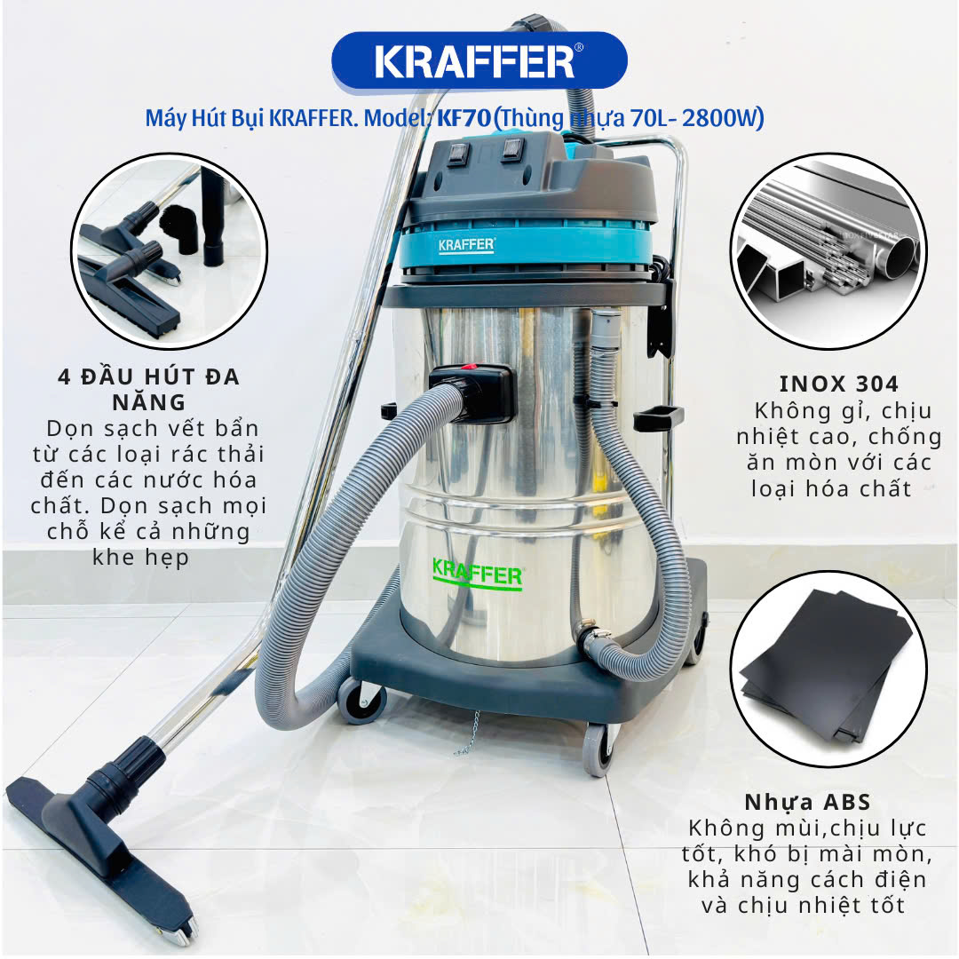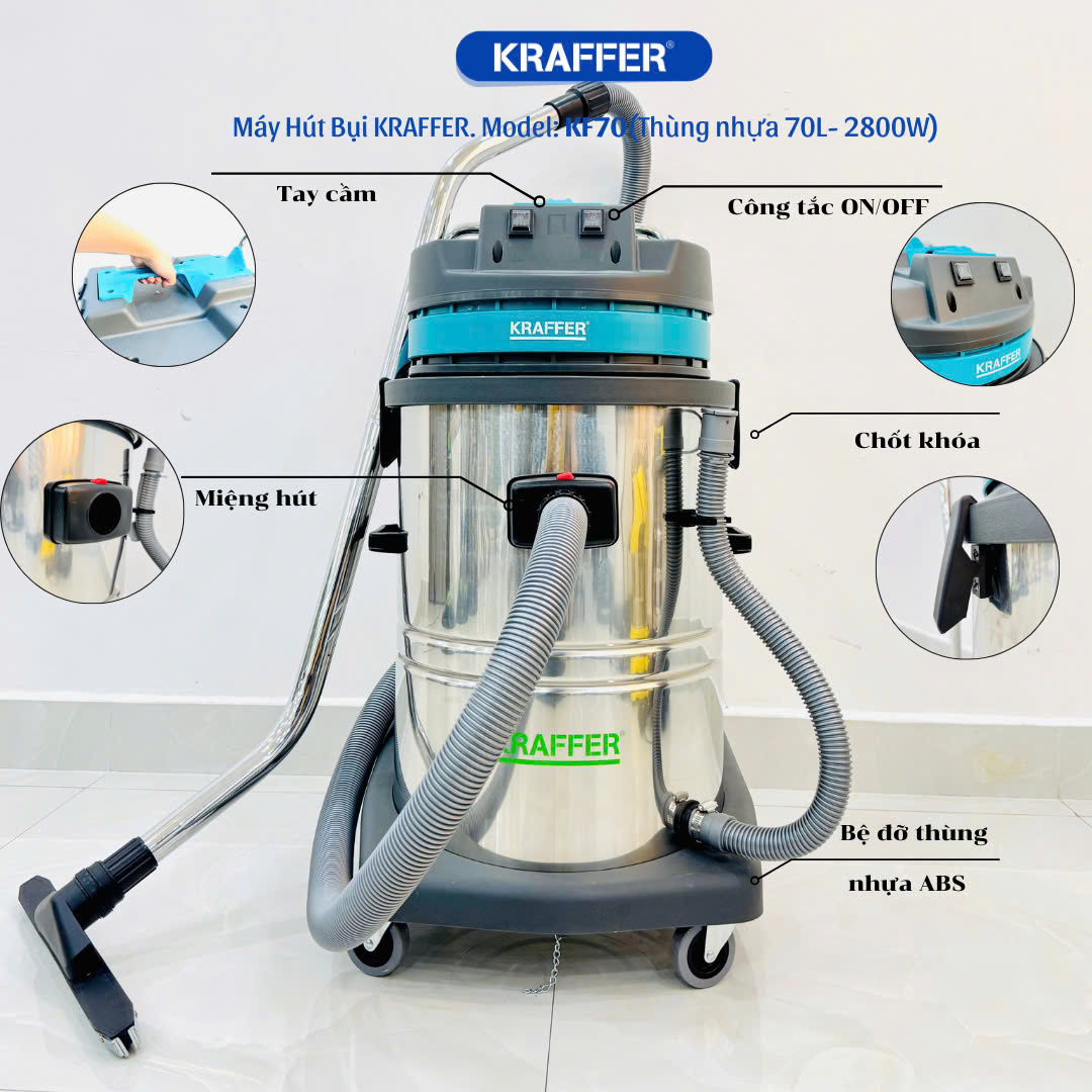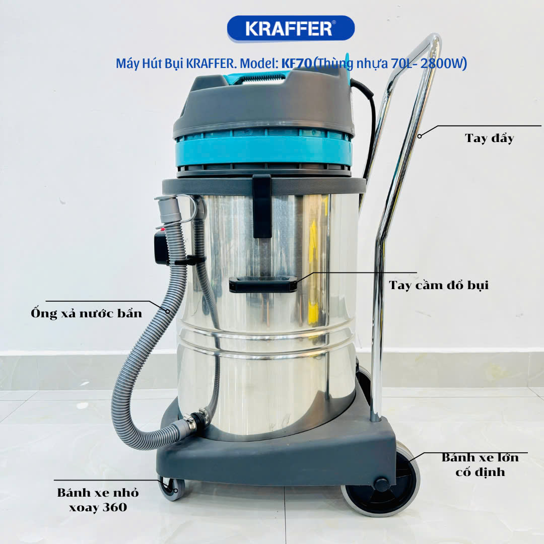 Nếu bạn đang tìm kiếm một chiếc máy hút bụi công nghiệp, KRAFFER KF70 là một lựa chọn tuyệt vời. Với công suất 2800W và lưu lượng khí 106L/S, máy có thể hút sạch bụi bẩn một cách nhanh chóng và hiệu quả. Đặc biệt, máy có thể hút cả khô lẫn ướt, nên bạn không cần phải lo lắng về việc sử dụng máy trong những ngày mưa hay khi vệ sinh sàn nhà. Với dung tích thùng chứa 70L, bạn không cần phải thường xuyên thay thế túi lọc, tiết kiệm thời gian và công sức của bạn.