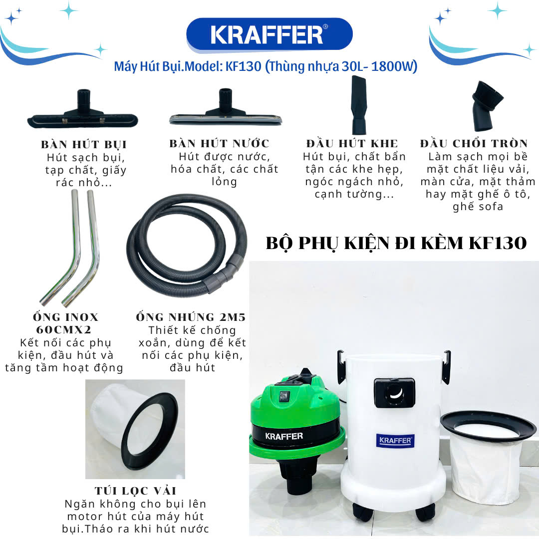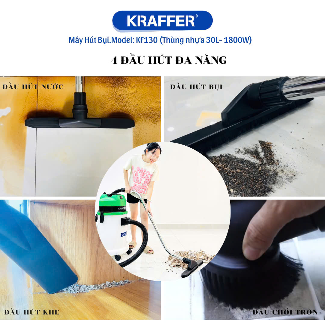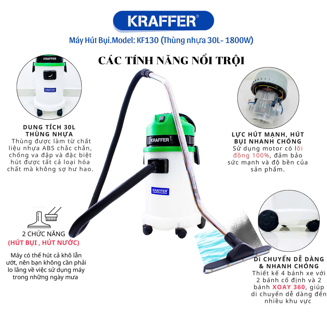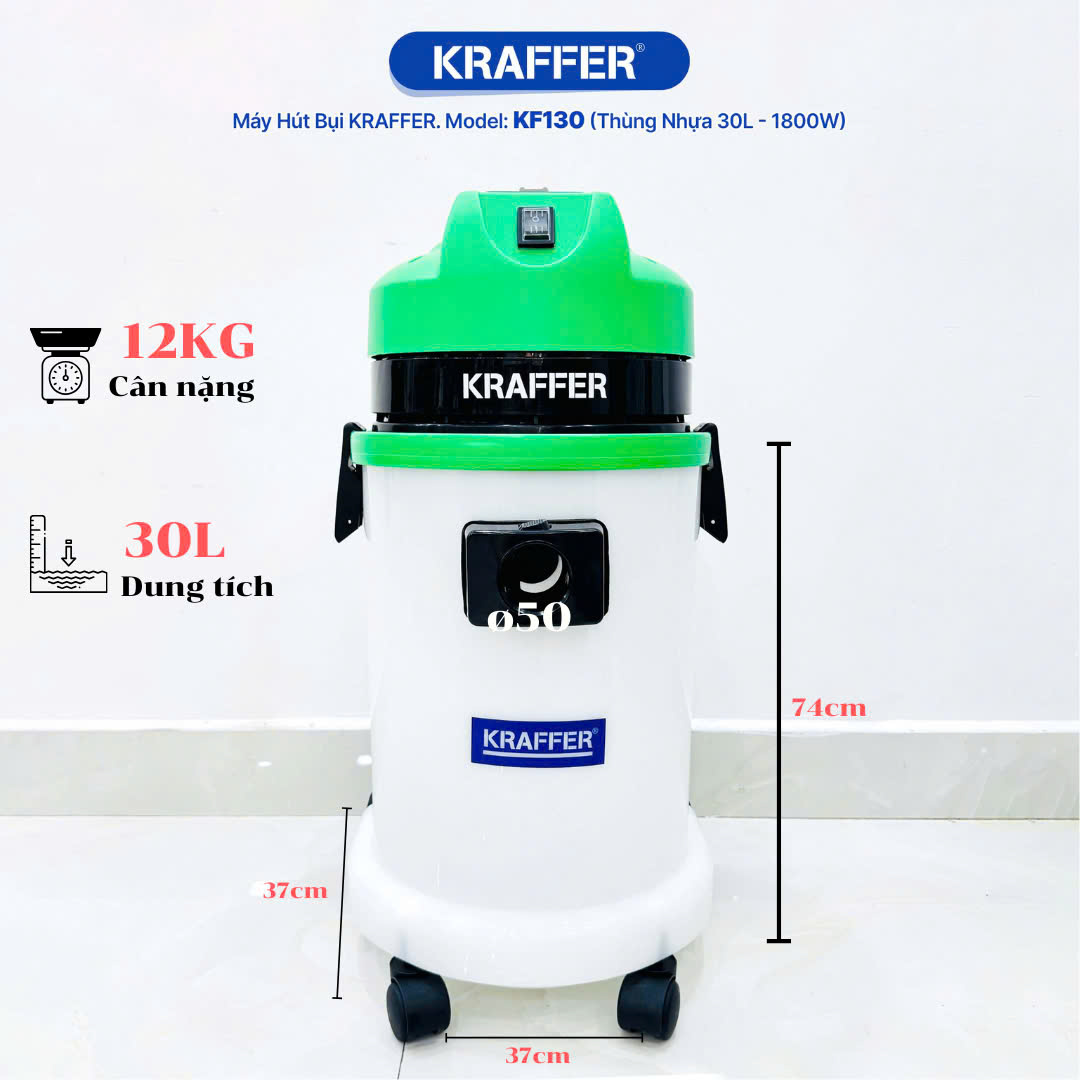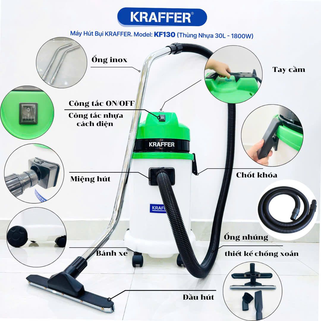 Nếu bạn đang tìm kiếm một chiếc máy hút bụi đa năng, KRAFFER KF130 là một lựa chọn tuyệt vời. Với công suất 1800W và lưu lượng khí 90L/S, máy có thể hút sạch bụi bẩn một cách nhanh chóng và hiệu quả. Đặc biệt, máy có thể hút cả khô lẫn ướt, nên bạn không cần phải lo lắng về việc sử dụng máy trong những ngày mưa hay khi vệ sinh nhà tắm. Với dung tích thùng chứa 30L, bạn không cần phải thường xuyên thay thế túi lọc, tiết kiệm thời gian và công sức của bạn.