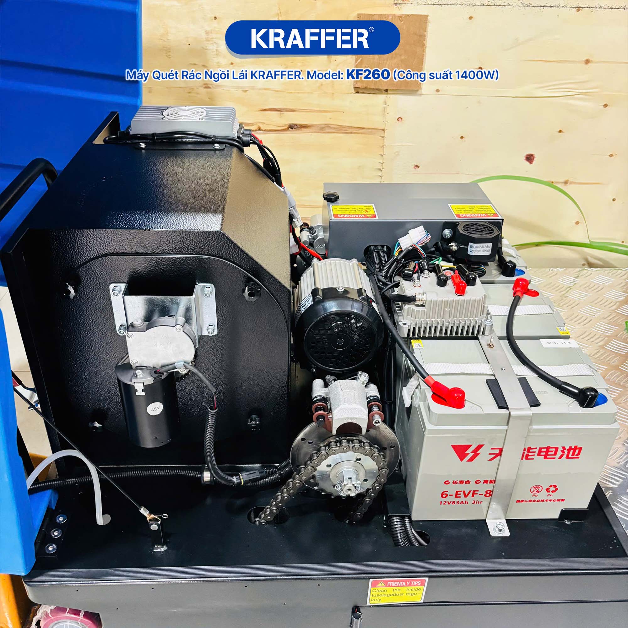 Máy được trang bị hệ thống chổi quét chính và chổi quét bên, cho phép quét sạch rác và bụi mịn trong một lần vận hành. Khả năng hoạt động trên nhiều bề mặt như sàn bê tông, gạch, và đường nhựa giúp Kraffer trở thành thiết bị linh hoạt và đa năng.