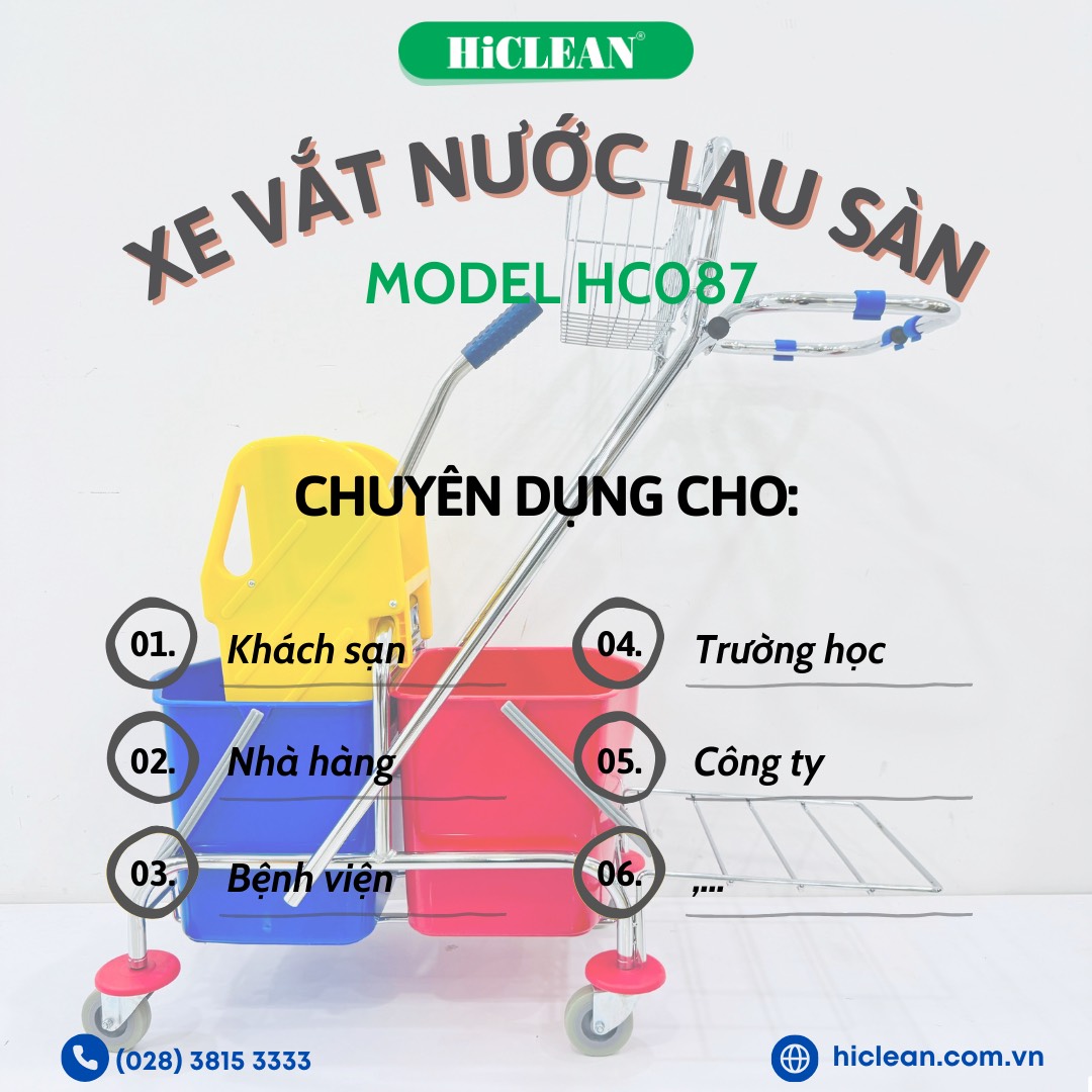 Sản phẩm xe ép nước lau nhà 2 xô HiClean HC 087 được thiết kế phù hợp cho việc làm sạch nhà cửa, văn phòng, khách sạn, trường học và các khu vực công cộng khác. Với tính năng dễ dàng sử dụng và vận chuyển, sản phẩm này giúp bạn làm sạch những khu vực khó tiếp cận một cách dễ dàng và hiệu quả.