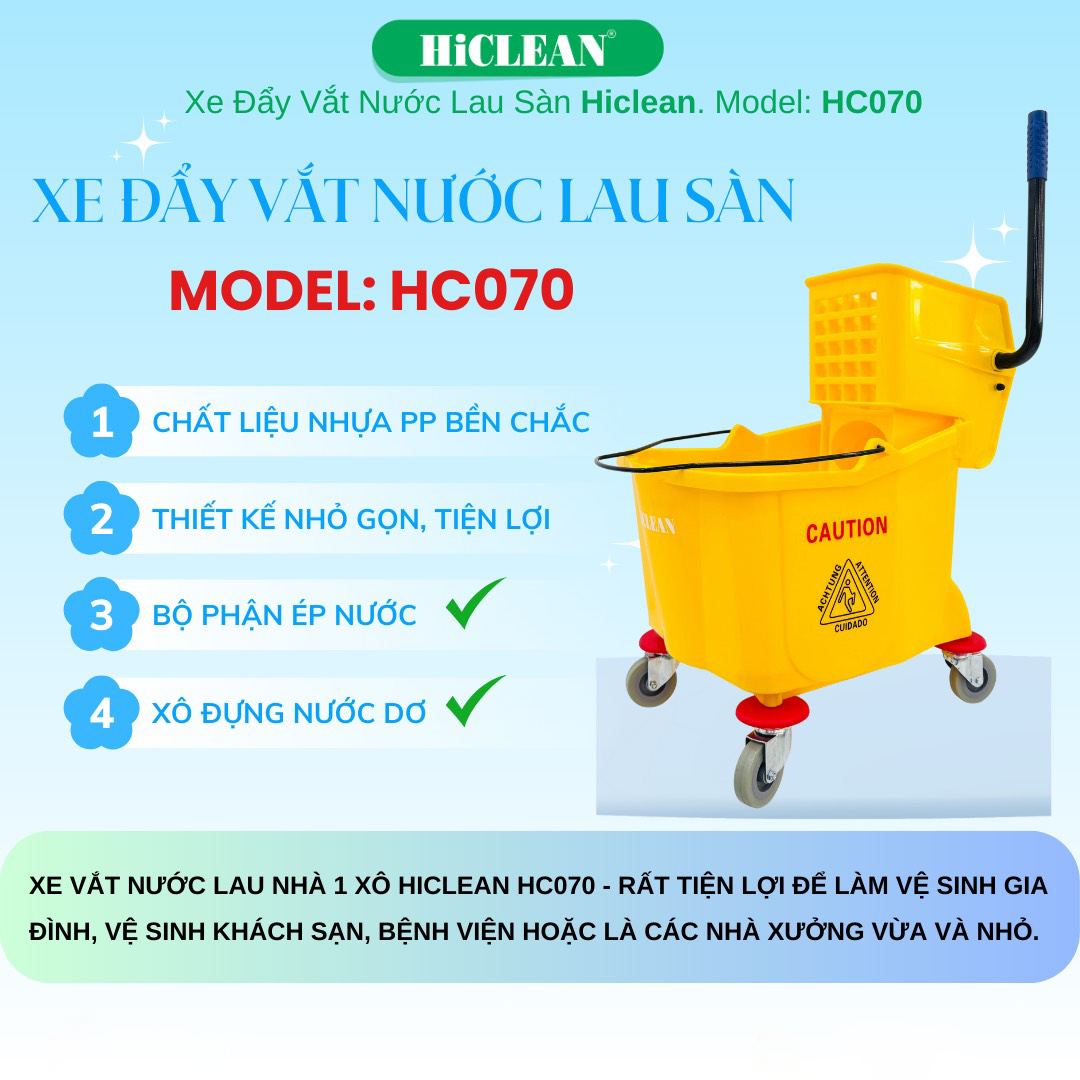 Bạn đang muốn tìm kiếm một thiết bị giúp bạn làm sạch hiệu quả hơn? Bạn đang cần tìm kiếm một sản phẩm chất lượng, đáng tin cậy để giúp bạn dễ dàng lau dọn nhà cửa một cách nhanh chóng? Nếu đúng vậy, thì xe vắt nước 1 xô HiClean HC 070 chính là sự lựa chọn tuyệt vời cho bạn.